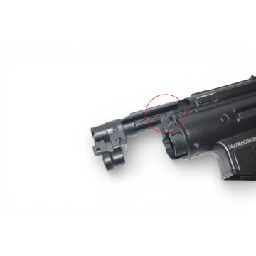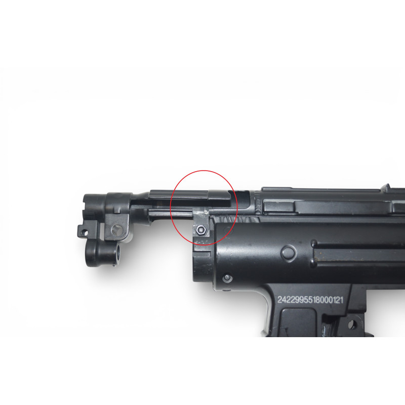 Uszkodzony / wyłamany kawałek koło dżwigni przeładowania. Nie przeszkadza w użytkowaniu. Po założeniu chwytu przedniego wszystko jest trzyma się sztywnie.